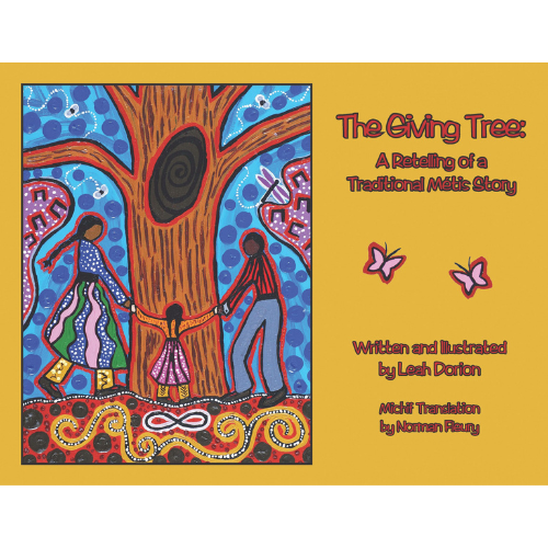 This charming story, richly steeped in Métis culture, focuses on the boyhood reminisces of Moushoom as he describes finding the “great giving tree” with his mother and father. This vibrantly illustrated children’s book is a beautiful retelling of a traditional Métis story. Both Leah Marie Dorion and the Gabriel Dumont Institute are very pleased to share this story with the Métis and larger communities since it emphasizes Métis core values and beliefs including strength, kindness, courage, tolerance, honesty, respect, love, sharing, caring, balance, patience, and most of all, the important connection with the Creator and Mother Earth. This resource also includes a Métis values chart, and a digital download of the narrations in English and Michif.